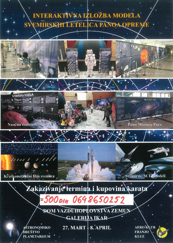 Астрономско друштво Планетаријум и Аеро клуб Фрањо Клуз организују занимљиву изложбу под називом – Интерактивна изложба модела свемирски летилица паноа опреме. Изложба се организује у Галерији Икар у Дому ваздухопловства у Земуну, у непосредној реализацији члана нашег Удружења др Славиша Милисављевић.