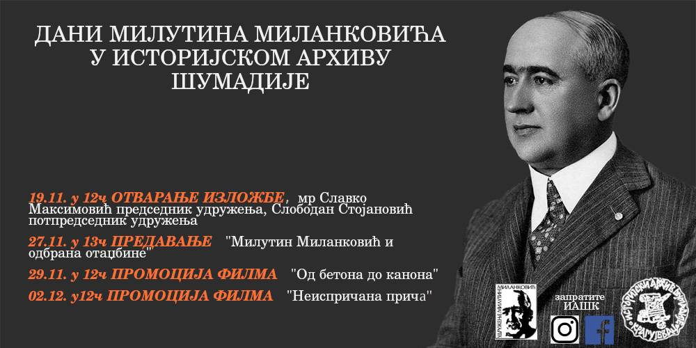 Историјски архив Шумадије Крагујевац, у сарадњи са Удружењем Милутин Миланковић организовао је тронедељну манифестацију Дани Милутина Миланковића у оквиру које ће бити реализовано више активности. Дани Милутина Миланковића отпочели су отварањем изложбе “Милутин Миланковић, живот и дело” 19. новембра којом приликом је посетиоцима приказан један од документарних филмова из продукције Удружења. У организацији Манифестације било […]