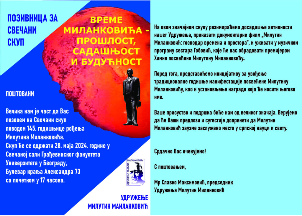 У Свечаној сали Грађевинског факултета у Београду одржан је скуп под називом “Време Миланковића: прошлост, садашњост и будућност” поводом обележавања 145. годишњице рођења једног од највећих српских научника двадесетог века, Милутина Миланковића. Свечани скуп је окупио је бројне угледне званице, професоре, студенте и поштоваоце лика и дела овог великана. Скуп су организовали Удружење Милутин Миланковић […]